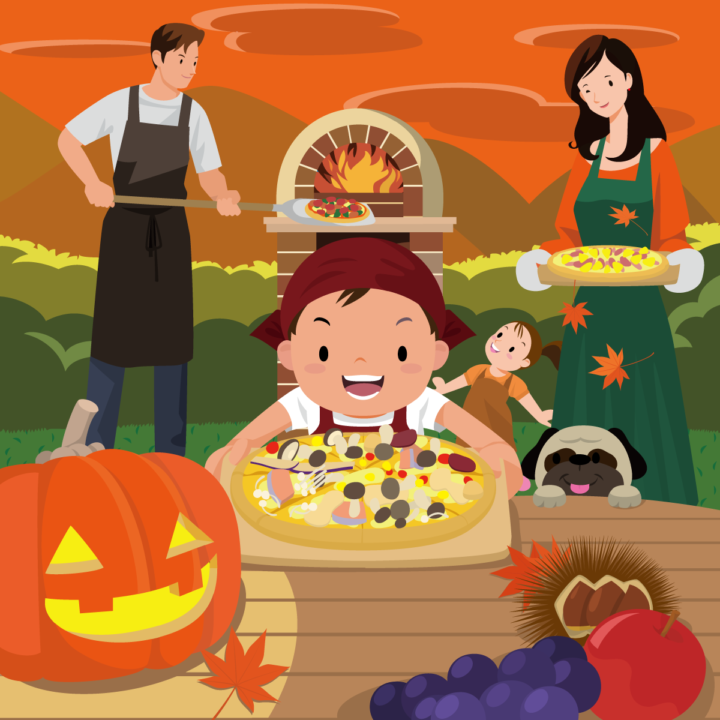 夕焼けの庭で家族がピザ窯を囲む。焼きたてのピザと秋の味覚が並び、ハロウィンのカボチャが彩りを添える温かなひととき。