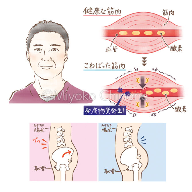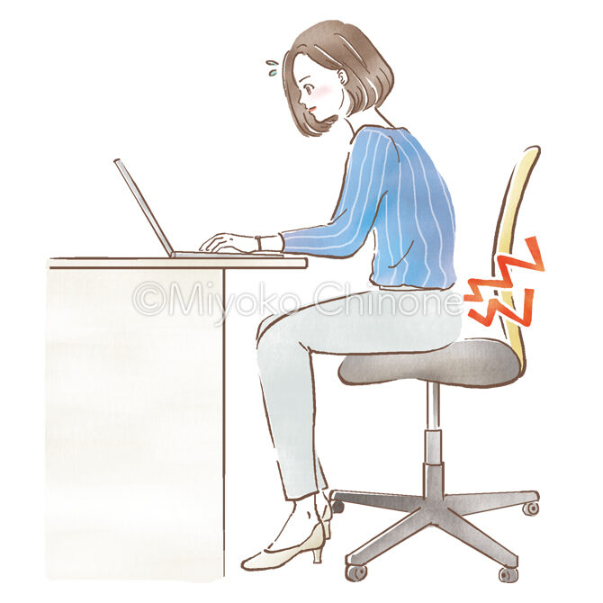 腰痛に悩む女性のイラストと、普段あまり似顔絵は描かないのですが、記事の監修の先生の似顔絵も描かせていただきました。