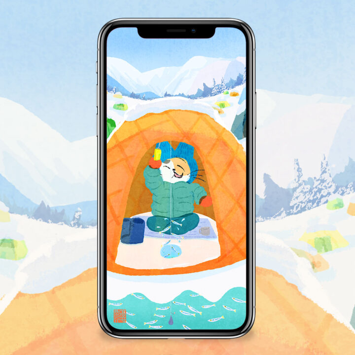 昨年の2月、はじめてワカサギ釣りをしてたのしかったのが印象的だったので、もともと2月はこのテーマに決めていました笑。寒さの厳しい時期なので、アクティブな明るい冬の情景を見て、元気を出してもらえるとうれしいです。