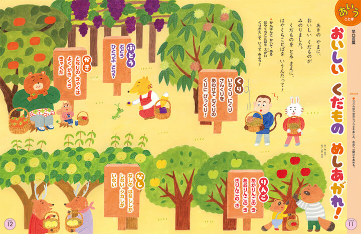 楽しい早口言葉に合わせて、どうぶつたちと秋の果樹園を描きました。このページを見ながら一生懸命早口言葉を言ってくれている子どもたちを、影からこっそり見たいです。