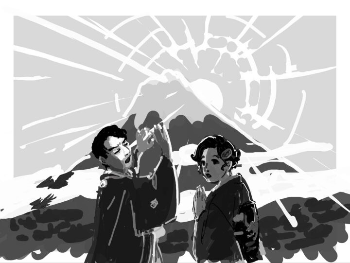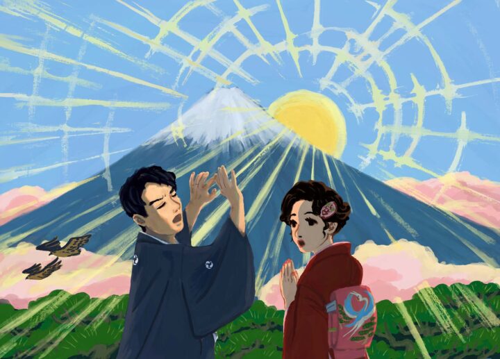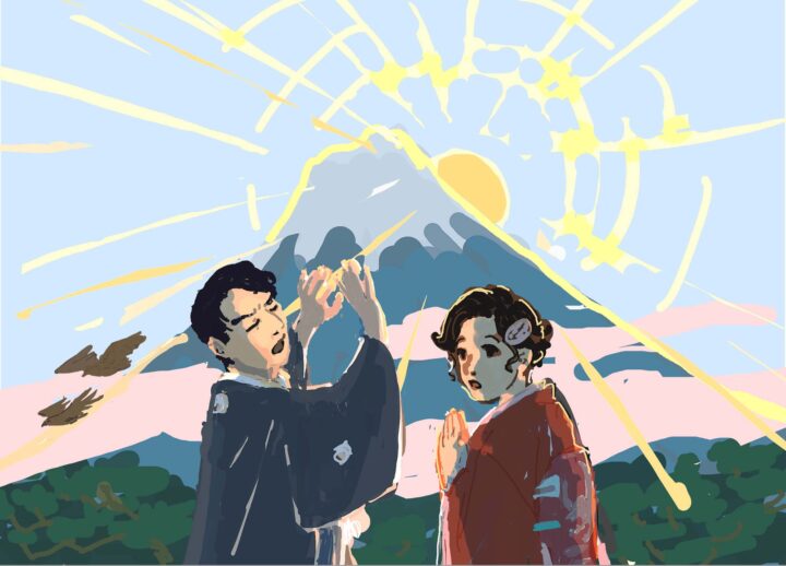 富士山の初日の出を眩しがっている40代の夫婦のイラスト、というご依頼だったのですが、