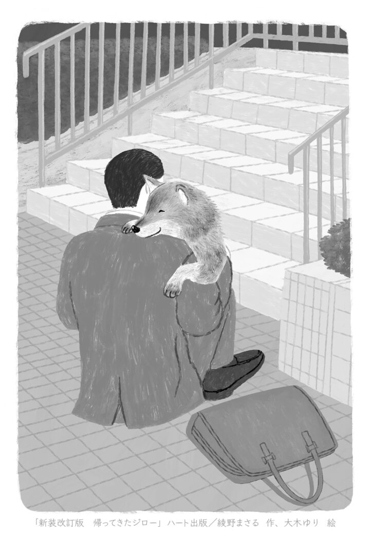 こちらのジローと飼い主さんが抱き合っている挿絵は、最初のページのものです。
