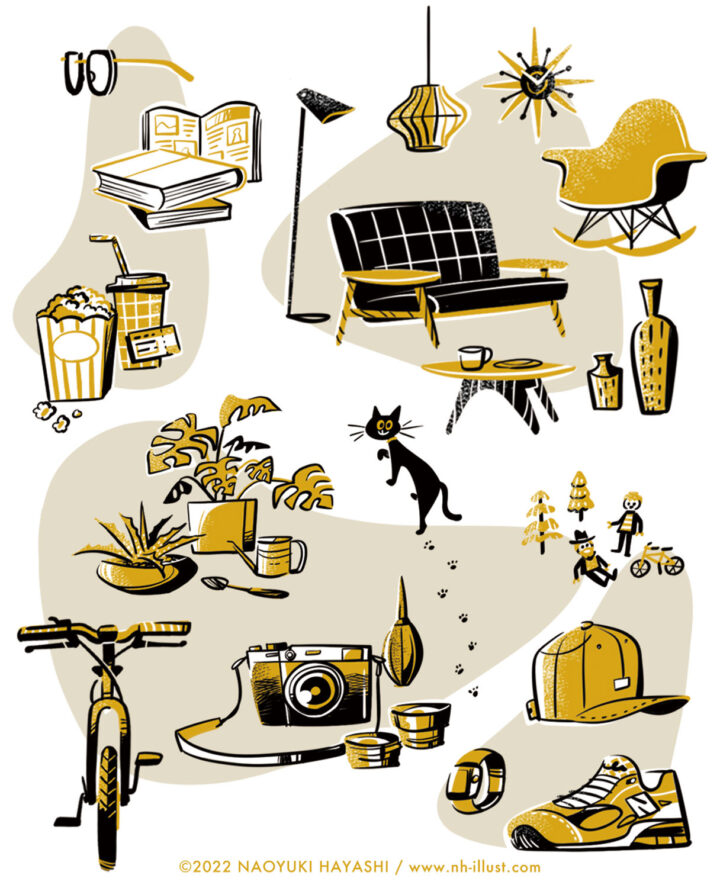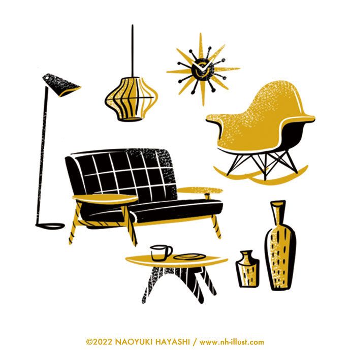 海外アニメーションやコミック、カートゥーンキャラクターに胸をときめかせた子ども時代。次第に海外の文化に心惹かれるなかで古き良きミッドセンチュリー時代の絵本やテキスタイル、家具、建築に大きな感銘を受け、それが現在の創作スタイルのベースに───
