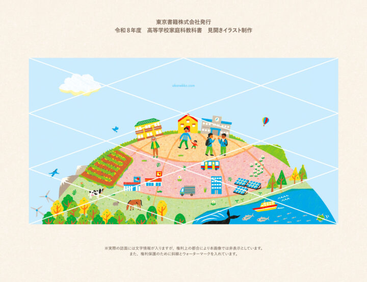 東京書籍株式会社発行 令和8年度 高等学校家庭科教科書 表紙イラストおよび見開きイラストを制作いたしました。