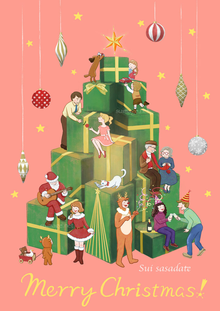 山ほどのプレゼントの上に、子供、恋人たち、家族、友達、老夫婦がそれぞれ楽しくクリスマスを過ごしているイラストです。