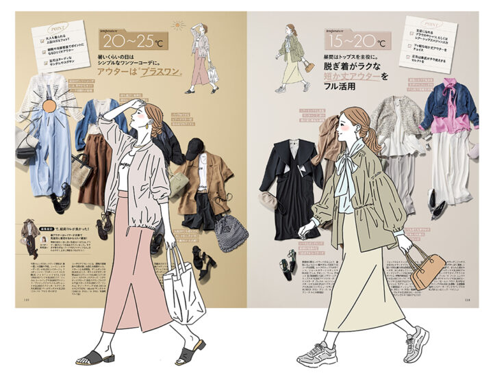 編集様からは各気温別にアイテム例をいただきましたが、それを参考にしながら基本的にこちらでご提案させていただき、ほぼ修正なくご納品できました。