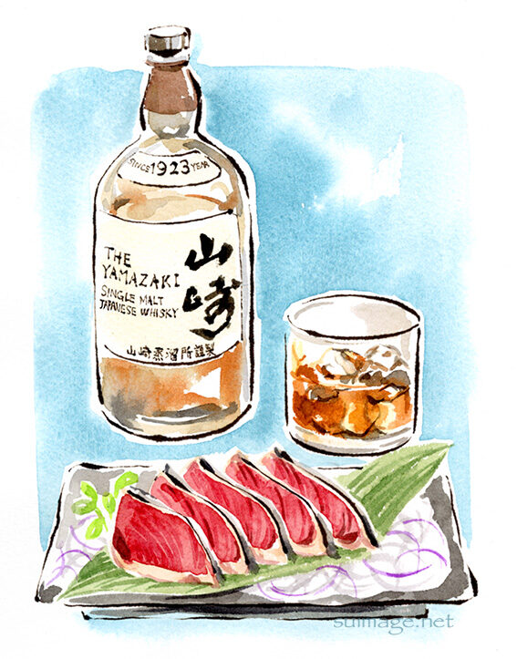 ウィスキーの水割りとおつまみの鰹のタタキを情緒的に表現しています。
