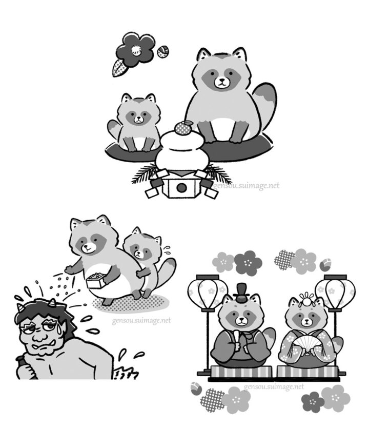 日本の行事や季節感を、親しみやすい動物キャラクターで描きます。