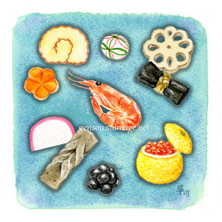 お正月の伝統料理であるおせち料理の定番(伊達巻き、煮しめ、黒豆、海老、かまぼこ、昆布巻き、いくら)を、やさしい水彩タッチで描きました。