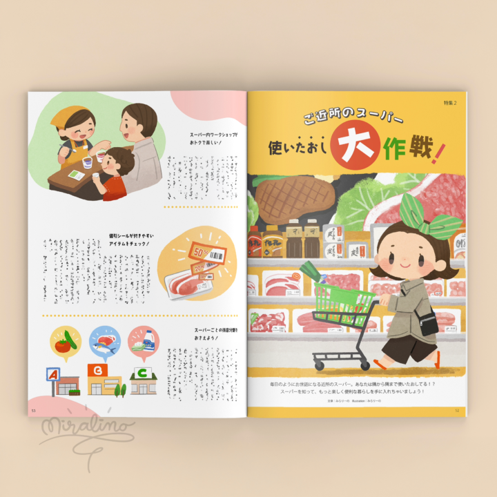 スーパーマーケットをテーマに、何点かイラストを制作してモックアップに仕上げました。たくさんの品物とで溢れる、楽しくて活気のある雰囲気を目指しました。