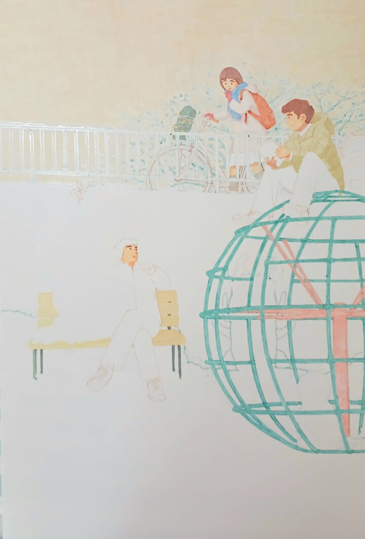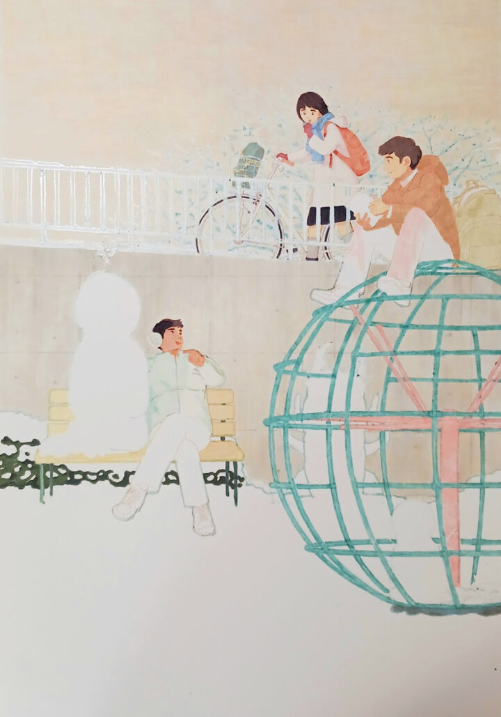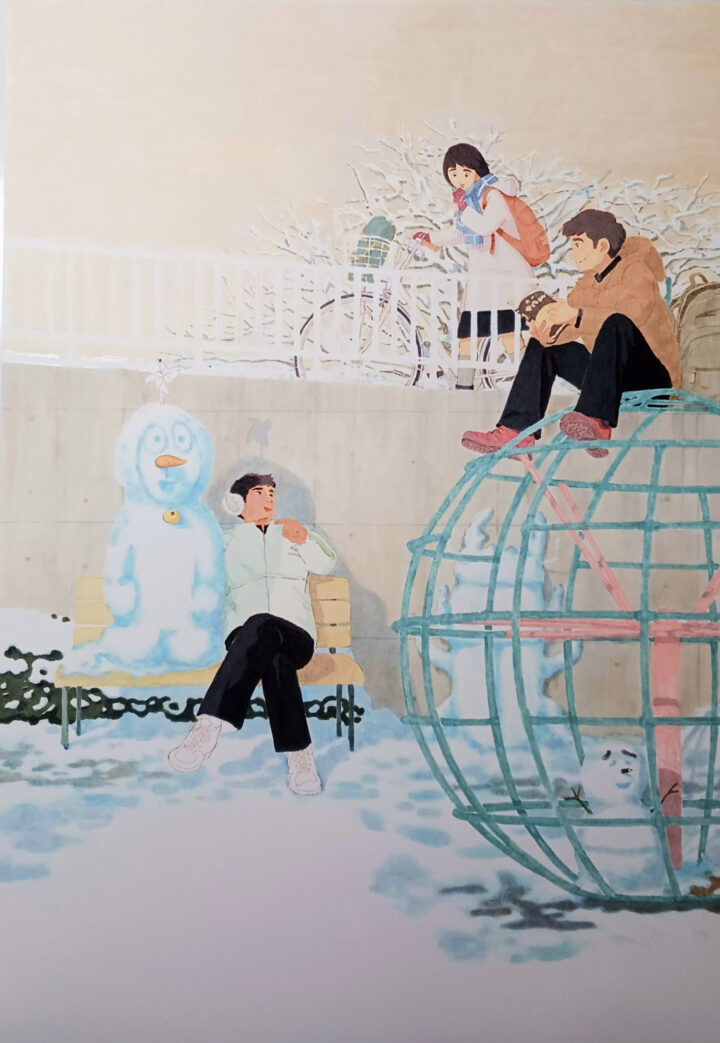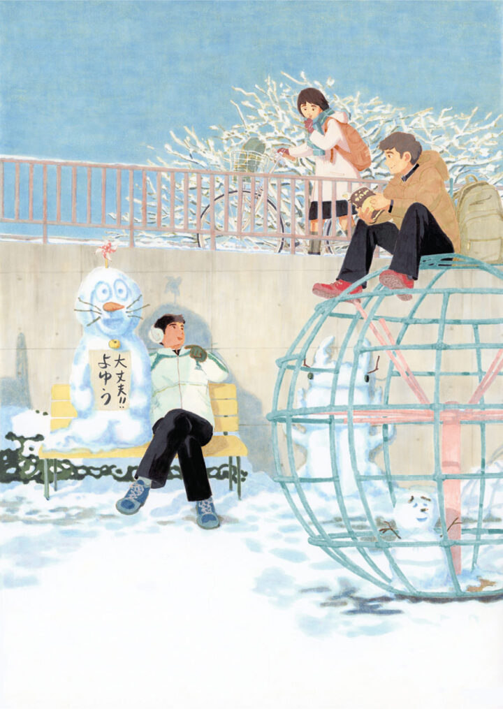 私立や推薦入試が始まり、共通テスト、国公立入試を控えソワソワザワザワする中、雪だるまを作って遊び束の間の息抜きをする受験生を描きました。