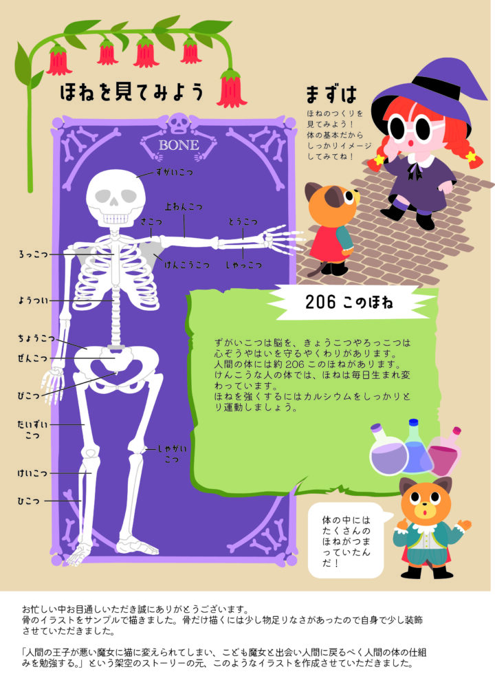 そこで今回は「人体」を楽しく学ぶためにお役に立てないかと「骨」のイラストのサンプルを描きました。