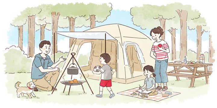 家族で過ごすキャンプのワンシーンを、やわらかな線と淡い色合いで表現したイラストです。
