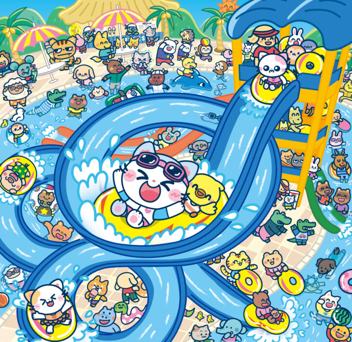 ウォータースライダーで大はしゃぎのくぅたんや、仲間たちを楽しく描かせていただきました。