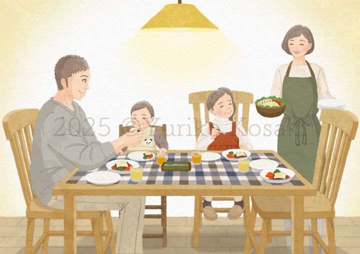 みんなで一緒に食べる様子を描こうかとも思いましたが、赤ちゃんがいると、なかなかそうはいかないもの。