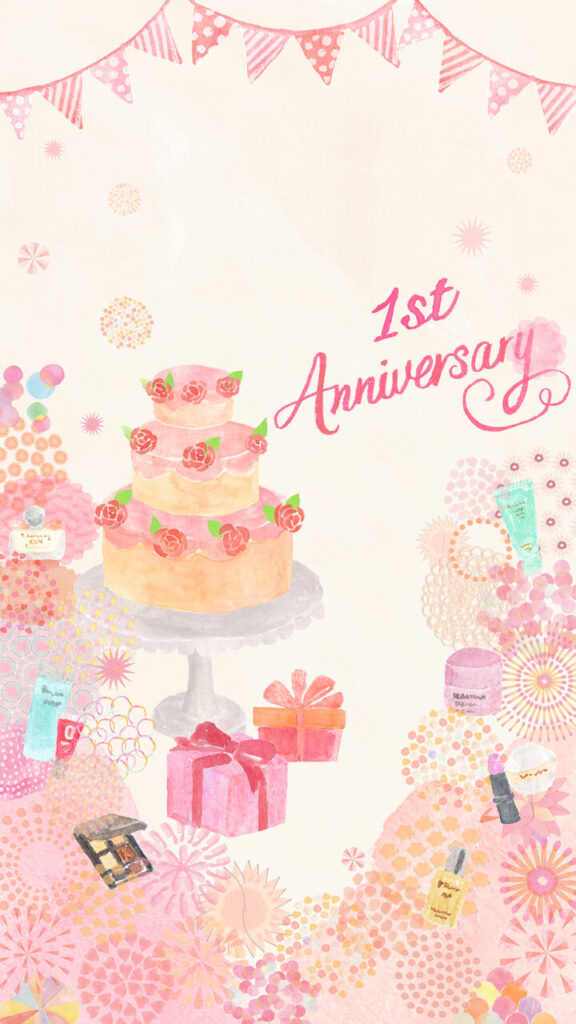 アプリ開設1周年記念のお祝いのパーティーをイメージにケーキ、ガーラント、化粧品などを描き、