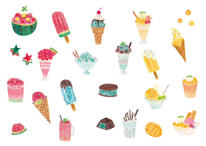 手描きのタッチを残し、サマーフードをキュートでカラフルに描きました。