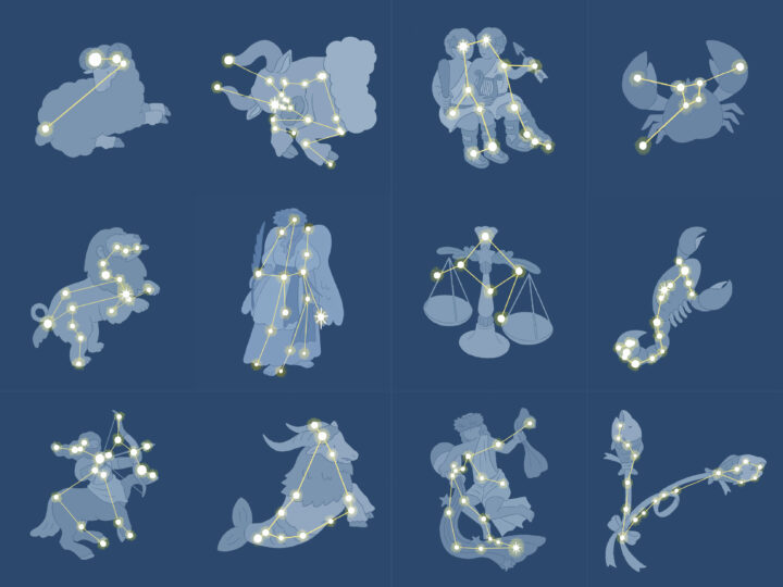 nowakiイラストワークショップ課題:12星座 にて、はじめて星について学ぶ幼児〜児童に向けた星座図をリデザインしました。