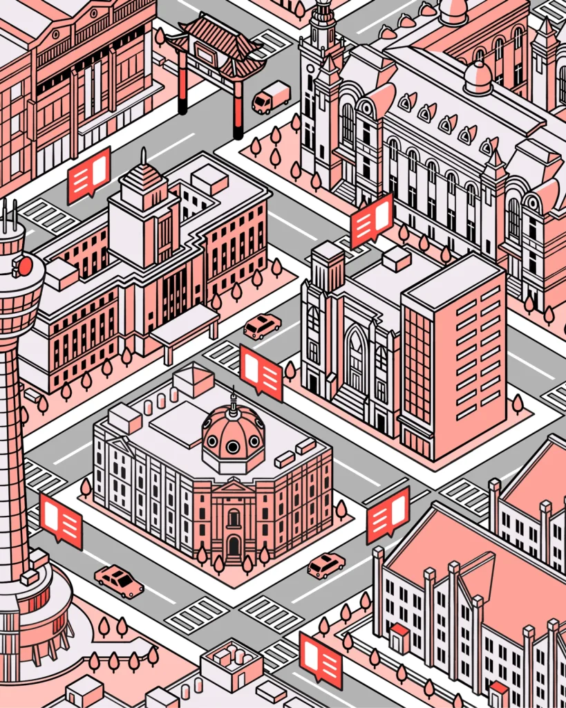 立体的な表現を用いて街並みや空間を俯瞰的に描いています。