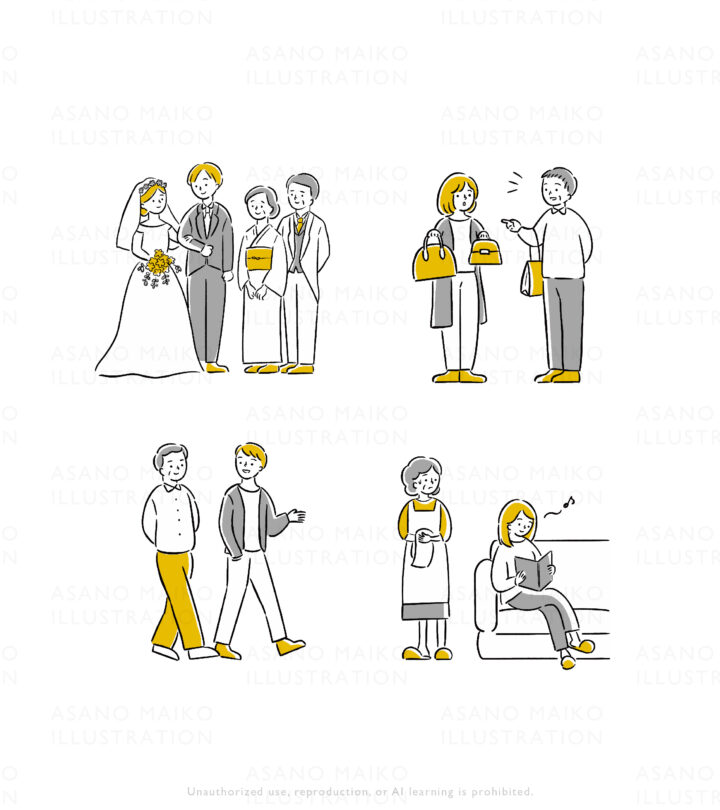 親子婚活に関する電子書籍『なぜかうまくいく家族縁結びの教科書』表紙イラスト・カットイラストを担当しました。親子の様子や仲人さんを描いています。