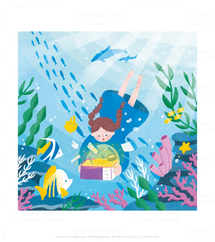 日本の文房具を海外ユーザー向けに販売されているzenpop japan様の文房具ボックス内カレンダーイラスト(9月)を担当しました。海がテーマでしたので、海の中で文房具の入った宝箱を見つけた女の子を描かせていただいています。