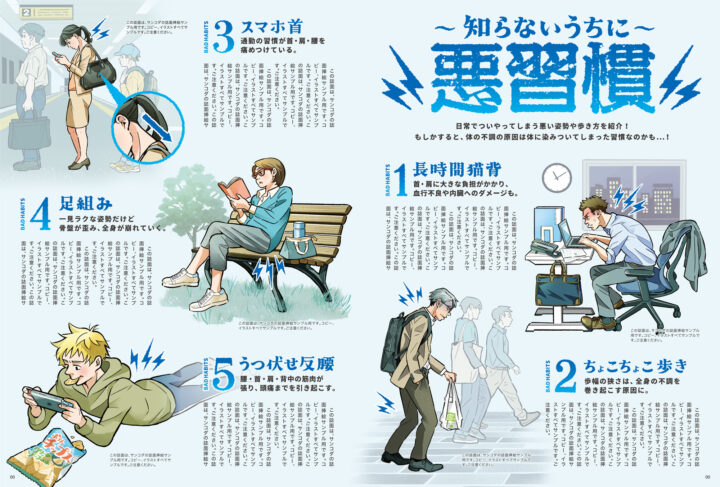 表紙には「疲労感からの解放」を象徴する爽やかな朝のシーンを採用しました。 見開き特集では「知らないうちに悪習慣」というテーマを想定し、猫背やスマホ首など日常の姿勢のクセを紹介。気づかずに行っている動作を カットイラストで可視化し、生活習慣を見直すきっかけとなる誌面を制作しました。