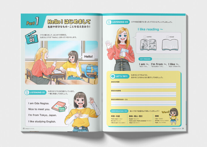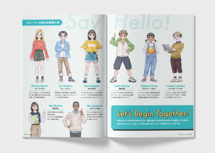 表紙は「Say Hello!」に合わせ、キャラクターが元気に 挨拶するシーンで親しみやすさを表現しました。見開きページではキャラクター紹介とワークページを制作 し、児童が場面をイメージしながら学べるよう、イラストで内容をわかりやすく示しました。