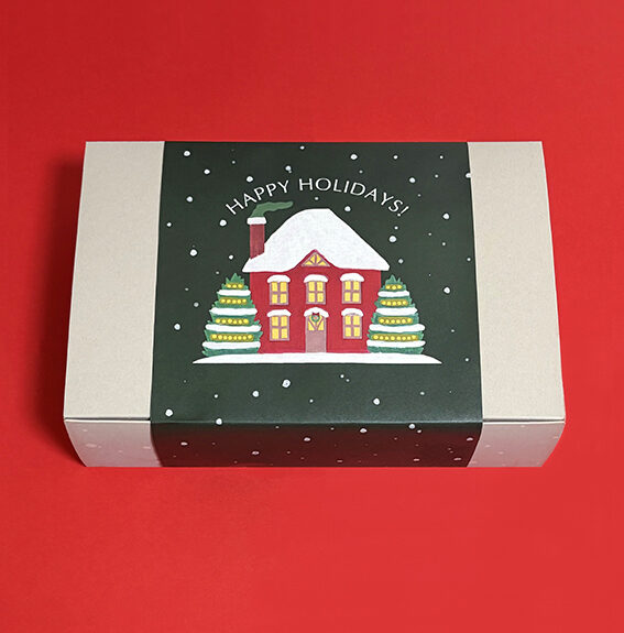 株式会社スペシャリティーズが運営する生スイートポテト専門店「OIMO」と、おもちのスイーツ「MOTCH」で使用されるクリスマスのギフトラッピングの掛紙用に、イラストレーションを作成しました。雪の積もる家と木を描いています。コラージュで作成しました。周りの雪もカットしたものをご使用いただいています。