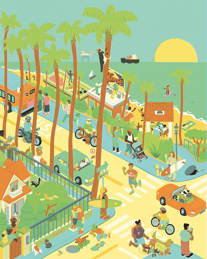 主に海外の雑誌や新聞、ブランドなどにビジュアルを提供しています。カリフォルニアの豊かな自然と太陽光の中で学んだビビットな色使いで、クスッとするイラストレーションやアニメーションを作るのが得意です。