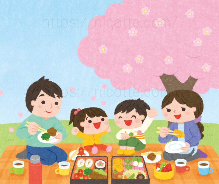 桜の木の下でごちそうを広げてお花見をしている様子を描きました。