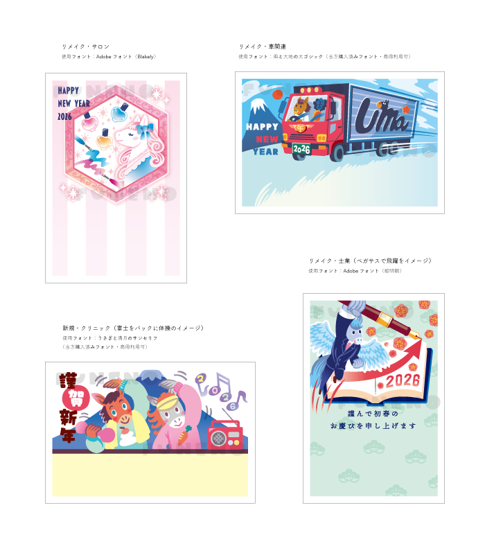 株式会社アイデア工房様の2025年巳年・業種別年賀状8点作成を担当いたしました。